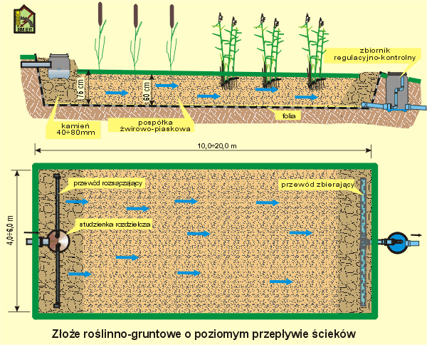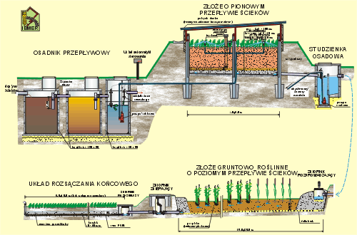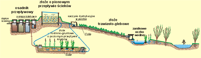 Konfiguracja poszczególnych członów oczyszczających dobierana jest indywidualnie w zależności od ilości ścieków oraz istniejących warunków terenowych. Warunkiem prawidłowej pracy i wynikającej z tego wysokiej jakości oczyszczania całej instalacji jest wstępne, tzw. mechaniczne, oczyszczenie surowych ścieków w prawidłowo wykonanym i należycie obsługiwanym wielokomorowym osadniku przepływowym (optymalnie trzykomorowym), wyposażonym w międzykomorowe, rurowe separatory zanieczyszczeń pływających (kożuchów), które usytuowane są w miejscach przepływu ścieków do sąsiednich komór. W pierwszej komorze osadnika ścieki są wstępnie oczyszczane mechanicznie (sedymentacja zawiesin nawet do 70 %), a także rozpoczyna się biochemiczny rozkład zawartej w nich substancji organicznej (gnicie, fermentacja). W pozostałych komorach ciecz jest klarowana i trwają dalsze procesy biochemiczne. Wypływające z ostatniej komory osadnika ścieki, choć znacznie oczyszczone w stosunku do doprowadzonych (sprawność oczyszczania substancji organicznej wyrażonej w BZT5 i ChZT zawiera się w przedziale 25 ÷ 50 %, a biogenów : azotu całkowitego i fosforu ogólnego w przedziale 10÷15 %), nie spełniają wymagań sanitarnych i nie można ich absolutnie odprowadzać do gruntu lub do wód powierzchniowych. Ścieki oczyszczone tylko w osadniku charakteryzują się jeszcze bardzo wysoką koncentracją zanieczyszczeń, wśród nich - szczególnie wysoką zawartością azotu całkowitego, a w nim: jego formy amonowej N-NH4, której stężenia sięgają wartości nawet do 180 mg/l, co powoduje poważne trudności technologiczne przy usuwaniu tego zanieczyszczenia z każdego układu oczyszczającego. Jak wykazały badania IBMER w Tyliczu, urządzeniem które decyduje o znaczącym zmniejszeniu w ściekach stężeń substancji węglowych BZT5 i ChZT (>90 % i >83 % zarówno w zimie jak i w lecie), a także stwarza sprzyjające warunki do wydajnej nitryfikacji azotu amonowego do azotu azotanowego (>60 % zarówno w lecie jak i zimie) jest złoże filtracyjne o przepływie pionowym. Ścieki oczyszczone wstępnie w osadniku, podawane są cyklicznie na powierzchnię tego złoża za pomocą odpowiednio dobranego układu pompowego i tryskaczy lub alternatywnie : naczynia wywrotnego i układu rur perforowanych. Infiltrując przez wierzchnią warstwę wypełnienia materiału filtracyjnego, stopniowo przesiąkają w dół złoża poprzez kolejne warstwy, od drobnej do grubej granulacji, a następnie, znacząco już oczyszczone, kierowane są odpowiednimi przewodami do następnych urządzeń w założonym ciągu oczyszczającym. Całkowita miąższość materiału filtracyjnego tego złoża może dochodzić do 100 cm. W efekcie procesów oczyszczania ścieków na złożu pionowym uzyskujemy prawie całkowite zmniejszenie zanieczyszczeń organicznych BZT5 i ChZT i częściowo fosforanów P-PO4. W znacznym stopniu zmniejsza się też koncentracja N-NH4 (azotu amonowego). W odpływających ściekach pozostają jeszcze nadmierne ilości azotu całkowitego NC, w którym dominują sole azotanowe. Ich usunięcie wymaga więc dalszych procesów oczyszczania w kolejnych urządzeniach, których ilość i rodzaj zależy od jakości i ilości poddawanych dalszemu oczyszczaniu ścieków oraz od wymaganego stopnia ich ostatecznego oczyszczenia. Kolejnym więc urządzeniem jest złoże gruntowo-roślinne o poziomym, podpowierzchniowym przepływie ścieków. Ścieki dopływają do niego poprzez studzienkę umieszczoną w jego warstwie kamienistej skąd następnie są rozprowadzane do całej objętości filtracyjnej złoża za pomocą specjalnie przygotowanych rur dystrybucyjnych. Wyposażenie wlotów do rur dystrybucyjnych ( wewnątrz studzienki ) w regulowane kolanka umożliwia równomierne rozdzielanie cieczy na obie strony szerokości złoża. Całoroczną, niezakłóconą hydraulicznie pracę złoża filtracyjnego zapewnia odpowiednio dobrany i luźno zasypany materiał filtracyjny oraz odpowiednio dobrana i nasadzona roślinność. Preferowane są nasadzenia mieszane w postaci jednorodnych pasów wybranych roślin wodnych lub wodnolubnych. Do wypełnienia przestrzeni filtracyjnej stosowane są materiały nieorganiczne, będące mieszanką żwirów i piasków, a także sortowana pospółka rzeczna. Rodzaj materiału wypełnienia złoża i jego granulacje dobierany jest indywidualnie w zależności od potrzeb filtracyjnych i lokalnych możliwości pozyskania. Nie powinno się stosować wypełnień zawierających domieszki ilaste, pyłowe oraz wtrącenia glebowe. Chociaż materiały ilaste mają zdolność wiązania, a tym samym usuwania ze ścieków fosforanów, to jednak mogą powodować trudności w utrzymaniu wymaganych warunków podpowierzchniowego przepływu ścieków w złożu (kolmatacja przestrzeni filtracyjnej) co z kolei nie sprzyja procesom oczyszczania pozostałych zanieczyszczeń. Zastosowanie wypełnienia żwirowo-piaskowego umożliwia bardzo szybki rozruch technologiczny złoża, a stopniowy rozwój biologiczny nasadzeń roślinnych ma za zadanie, oprócz poboru części związków biogennych i zmniejszenia ładunku odpływających zanieczyszczeń (parowanie wody), zapewnić w rozwiniętej strefie korzeniowej dogodne warunki dla rozwoju osiedlających się tam bakterii i innych mikroorganizmów, mających istotny udział w procesach oczyszczania ścieków. Podczas oczyszczania ścieków w złożu filtracyjnym o przepływie poziomym występują dalsze procesy biochemicznych reakcji utleniająco-redukcyjnych, fizycznej sorpcji zawiesin i koloidów, chemicznej sorpcji związków nieorganicznych (fosfor), jak również asymilacji i wbudowywania w masę roślinną zmineralizowanych produktów tych reakcji. Może następować znacząca eliminacja ewentualnych mikroorganizmów chorobotwórczych i jaj pasożytów, przy czym pierwszym urządzeniem, w którym następuje ich zatrzymywanie jest osadnik. W o
