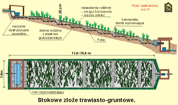 zalegających pod nim wód podziemnych Na dnie złoża, w jego końcowej części, usytuowana jest rura zbierająca, która gromadzi oczyszczone ścieki i odprowadza je do studzienki odpływowej. Studzienka ta pełni również rolę kontrolno-regulacyjną poprzez zastosowanie w niej odpowiednio wykonanej rury kolankowej, pełniącej rolę regulatora poziomu ścieków w złożu. W sekwencji zaproponowanych urządzeń, złoże gruntowo-roślinne o poziomym przepływie ścieków ma stwarzać warunki do denitryfikacji azotanów, do zatrzymania związków fosforu i dalszej mineralizacji substancji węglowych, w efekcie czego w odpływających z niego ściekach powinien zostać osiągnięty wymagany przepisami poziom stężeń azotu i fosforu. Do doczyszczenia ścieków można zastosować kolejne urządzenie: tzw. stokowe złoże trawiasto-glebowe lub trawiasto-gruntowe (w zależności od rodzaju zastosowanego wypełnienia). Ogólnie, jest to budowla ukształtowana w formie pasa z odpowiednio skonfigurowanym i izolowanym dnem, na który ścieki podawane są w sposób cykliczny za pomocą urządzeń z naczyniem wywrotnym, przy czym powierzchnia i długość tego złoża, zależy od ilości zadawanych ścieków i stężeń zawartych w nich pozostałych jeszcze zanieczyszczeń. Dotychczasowe badania wykazały, że opisane wyżej złoża stokowe mogą spełniać znaczącą rolę w procesach oczyszczania ścieków bytowo-gospodarczych z zagród górskich. Złoża te można bowiem stosować albo do doczyszczania ścieków, jako kolejny stopień w sekwencji urządzeń oczyszczających, lub również, jako główny element instalacji oczyszczających ścieki surowe, pochodzące wprost z osadnika. Konieczne jest jednakże, w tym przypadku, zastosowanie na ich początku wstępnego złoża o przepływie pionowym, ale już o zmniejszonym module powierzchni. Przy oczyszczaniu ścieków surowych w tego typu stokowym złożu darniowo-glebowym osiągnięto (badania IBMER Tylicz) bardzo wysoką skuteczność zmniejszania stężeń jonów amonowych, sięgającą w okresie letnim nawet 95 %, uzyskując w odciekach tylko śladowe ilości N-NH4, przy pierwotnych stężeniach tego zanieczyszczenia w ściekach dopływających do złoża sięgających 180 mg/l ! Końcowym członem w prezentowanych instalacjach są specjalne układy dystrybucyjno-rozsączające (odpowiedni układ płytkiego rozsączania ) służące do podpowierzchniowego odprowadzania oczyszczonych wód pościekowych do biologicznie czynnej warstwy gleby. W warstwie tej, pokrytej trwałym użytkiem trawiastym, ewentualne, pozostałe w odcieku resztki zanieczyszczeń, w tym związków nawozowych, podlegają procesom właściwym dla filtracji w glebowym ośrodku porowatym i są wykorzystywane przez rośliny. Wybrany obszar użytku zielonego może być uzupełniony nasadzeniami krzewiastymi (głównie wierzba), które odpowiednio rozmieszczone mogą spełniać rolę dodatkowych roślinnych pasów filtracyjnych (np. roślinna przegroda buforowa zabezpieczająca strefę brzegową potoku. Alternatywnym rozwiązaniem odbiornika oczyszczonych ścieków może być zanikowe oczko wodne obsadzone roślinnością bagienną, którego kształt i wielkość można pozostawić inwencji własnej mieszkańców gospodarstwa. |